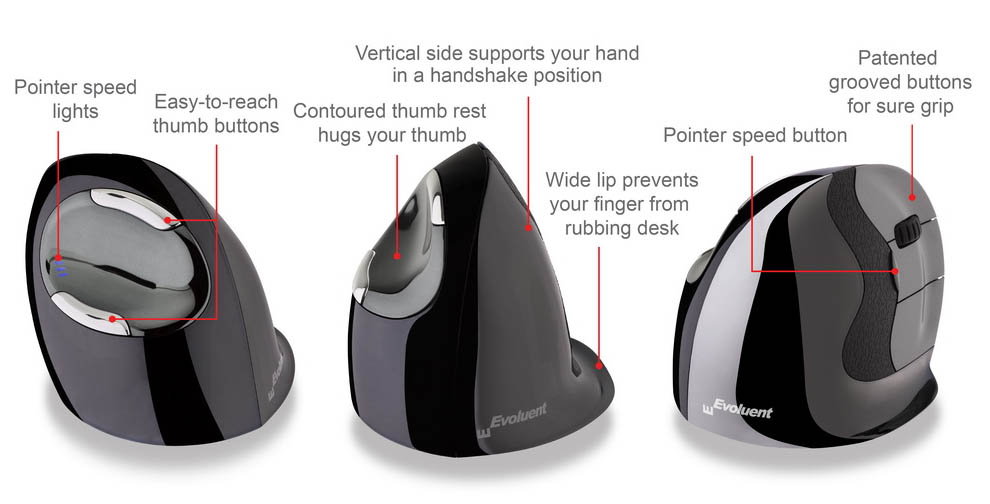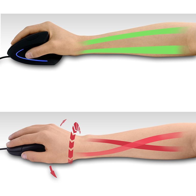 Majorité des souris disponibles sur le marché ne correspondent pas aux exigences ergonomiques nécessaires pour améliorer le confort de l’utilisateur. Le prolongement naturel du bras est à la verticale, et non à l’horizontal ! Choisir une souris verticale permet de prévenir l’apparition de symptômes liés à une mauvaise position du poignet : TMS (troubles musculo squelettiques), tendinites, douleurs situées au niveau du poignet, du bras et ou du dos.